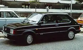 The Series 2 version of the 127 debuted in May 1977.[6] Although the bodyshell remained fundamentally the same, the Series 2 hinted towards a more angular styling direction which would be seen in the Ritmo/Strada the following year. It featured a restyled front and rear and larger rear side windows without the curved beltline of the original, which was replaced with a distinctive "Hofmeister kink" on the C-pillar. The new rear quarter pressings were derived from those used on the Brazilian market Fiat 147, although without the rear quarter extraction vent used in South America. The Series 2 also offered the option of the 1049 cc engine - uniquely for the 127 this was the five-bearing OHC "Brazil" engine from the 147 rather than the Fiat OHC unit from the 128. The tailgate was extended and now reached nearly to the rear bumper, addressing complaints about the high lip over which luggage had to be lifted for loading into the earlier 127 hatchbacks.[5] The interior was revised with a new dashboard which was identical in layout to the original car but was plainer in appearance and lost the wood embellishment of the Series 1. The underside of the dashboard was tidied up with new cover panels to enclose the steering column, brake master cylinder (on right hand drive versions) and the pedal mechanisms.