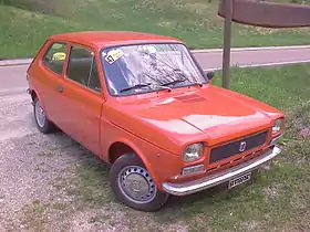 Developed towards the end of the 1960s, the Fiat 127 was launched as a two-door saloon in April 1971. A three-door hatchback, using an identical body profile but with a full-depth rear door and folding rear seat, was launched in March of the following year; this would prove to be the most popular version of the 127.[2] This was Fiat's first supermini-sized hatchback. The 127 featured a state-of-the-art transverse-engine/front-wheel-drive layout, with the transmission mounted on the end of the engine. Both design ideas had been fully vetted by Fiat, using its Autobianchi subsidiary 1964 Primula, 1969 A112 and A111 precisely because the models were not targeted for large production. The larger Fiat 128, launched in 1969, was the first Fiat-badged car to use the same transverse powertrain layout. The 127, like the A112, used a shrunken version of the 128 platform, as well as the rugged Fiat OHV 100 series 903 cc engine that had powered the Autobianchi and, with various cylinder capacities, earlier generations of Fiat cars. The 127 also featured a unique transverse leaf spring suspension at the rear. Safety was another area of innovation: the 127 included an articulated steering column and crumple zones for progressive deformation under impact.