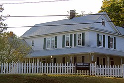 The house is Folk Victorian as opposed to high-style Victorian, as the house has Victorian features but retains a simplistic and folksy architectural style, as it was designed for a middle-class family. Victorian features of the home include irregular roof lines, turned porch posts and beaded ceilings.[3] Wainscoting on the lower level of the home is a Victorian feature, but the upper level of the house has unfinished walls. The house has one bathroom, several bedrooms (now used as offices and classrooms) and a kitchen, with an antique farm sink and original cupboards. The doors have louvered windows to keep the house ventilated. The downstairs area has a large, wide hallway, a convention of Victorian architecture. The upstairs has a large landing and several rooms, including a small room which houses the staircase leading to a large attic. The house, in country style, has a large front porch, a back porch leading from the kitchen, and a sunroom. Victorian stained glass was installed by Dr. Elias Benton Vickery in the bathroom.