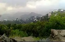They are as high as 7,000 ft (2,100 m) and they cover an area of almost 600 km2 (230 sq mi).[1][2] This group of mountains constitutes a part of the Sarawat range,[3] which is generally considered to be divided into two subranges within western Saudi Arabia: the Hijaz Mountains in the north (towards the Levant) and the 'Asir Mountains in the south (towards Yemen).[4][5] Unlike many other mountains in Saudi Arabia, the temperature of Fifa mountains is generally moderate.[2] The jagged rock formations are covered with green flora and have many agricultural terraces.[2][3] The various fields scattered around the mountains are known for their very high peaks and green terraces. Moreover, the most famous crops planted in the fields are coffee and maize. The mountains twist around each other. Thus, from a distance, the mountains appear as one pyramid-shaped mountain.[2]