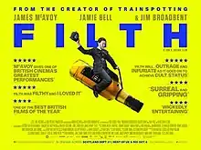 Filth is a 2013 black comedy crime film written and directed by Jon S. Baird, based on Irvine Welsh's 1998 novel Filth. The film was released on 27 September 2013 in Scotland, 4 October 2013 elsewhere in the United Kingdom and in Ireland, and on 30 May 2014 in the United States.[5] It stars James McAvoy, Jamie Bell, and Jim Broadbent.