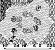 The gameplay is similar to the original The Legend of Zelda for the NES: the world is viewed from a top-down camera angle, it is divided up into many different squares that can fit on the screen, and the main character can move up, down, left, and right across the screen. The player can interact with individuals within towns by gathering information and buying or selling items and equipment. A variety of enemies can be battled on a field screen to gain experience, GP, and items. Within dungeon areas, a number of puzzles may be present and required to be solved in order for the player to advance. The player can also save at any point. A number of weapons can be found throughout the game to maneuver through obstacles such as cutting through trees and thorns.[4]
