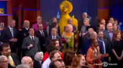 During the episode Colbert sings the 1939 song "We'll Meet Again" in its entirety alongside a large group a recognizable figures, most of which had previously made guest appearances on the show. The group featured celebrities, musicians, political figures, television personalities, film directors, news anchors, journalists, people involved in the military, writers, activists, and other prominent people not in the aforementioned categories. The crowd also featured the staff of the show, members of Colbert's family, and fictional characters. The majority of the crowd assembled inside the studio, while others were pre-taped in advance.[16][17][18]