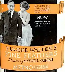 Fine Feathers is a 1921 American silent film directed by Fred Sittenham and starring Eugene Pallette, Claire Whitney, Thomas W. Ross, Warburton Gamble and June Elvidge, produced and distributed by Metro Pictures Corporation. The library of Congress shows a release date of June 20, 1921[1] but there is evidence that Fine Feathers was being screened on June 18 at the Rose Theater[2] in Santa Rosa California and as early as June 17 at the Star Theater in Monterey California.[3] This production is the second movie adaptation of Eugene Walter's 1912 play of the same name. Three complete 35 mm copies were donated by M.G.M. to the U.S. Archive.[1] A nitrate picture negative, an acetate positive print and an acetate fine grain master, all kept at the Eastman Museum in Rochester, NY.[4]