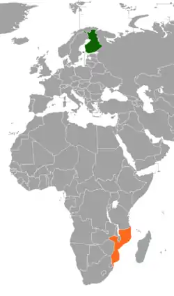 Finland–Mozambique relations refers to the bilateral relationship of Finland and Mozambique. Finland recognised Mozambique on July 4, 1975. Both countries established diplomatic relations on July 18, 1975. Mozambique is represented in Finland through its embassy in Stockholm, Sweden. Finland has an embassy in Maputo. In November 2008, Finland's President Tarja Halonen called her country's relationship with Mozambique "excellent".[1]