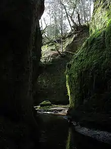 Finnich Glen in Stirlingshire, is a short, steep glen up to 70 ft deep which runs east from Finnich Bridge on the A809. It was carved from the red sandstone by the Carnock Burn.