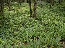 Fiordland National Park contains the majority of the largest area of unmodified vegetation in New Zealand. The dense forests, often clinging to steep valley sides, comprise mostly silver beech and mountain beech, but also podocarps. A large variety of shrubs and ferns, often dominated by crown fern, make up a rich understory of plants, with the forest floor covered in mosses and liverworts.[14] The abundant vegetation is supported by the high rainfall, but continues to be damaged by introduced species such as red deer and possum.[15][16][17]