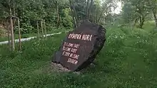 On 4 June 2019, a monument near the former homeless settlement called Dýmová hora was unveiled by artist Epos 257. The author made with one of its former inhabitants, Marcel, a trained stonemason. The work has the form of a large stone, on which stands a copper inscription FIRE MOUNTAIN, WE WERE HERE, WE LIVED HERE, WE ARE NO LONGER HERE, GOODBYE.[2]