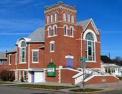 The church faces south onto 1st St. It has "Italianesque round arches and an accompanying Renaissance flavor" and was designed by architects Nisbet & Paradice. The nomination document describes its exterior as "imposing", and goes on:[2]