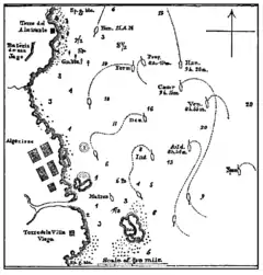 Hannibal was now isolated at the northern end of the British line, under heavy fire from Formidable as well as the Spanish shore batteries and gunboats and unable to manoeuvre or effectively respond. Ferris attempted to notify Saumarez of his ship's precarious position, but his signal halyards had been torn away by shot and it was sometime before assistance could be organised.[19] The rest of the squadron was ordered to provide ship's boats to attempt to tow Hannibal off the shoal but the attempt failed, Caesar's pinnace sinking in the process after being struck by a cannonball.[21] Ultimately, Hannibal was left stranded as the last of the seabreeze disappeared, preventing any of the other British ships from coming to Ferris' assistance. There was, however, a light land breeze from the northwest that initially favoured the outnumbered and battered French squadron, Linois immediately ordering his ships to sever their anchor cables and use the breeze to manoeuvre slowly into stronger defensive positions closer inshore. His flagship Formidable successfully completed the manoeuvre, but neither Indomptable nor Desaix could be brought back under control in time, and both grounded, Desaix directly in front of Algeciras and Indomptable northeast of Isla Verda with her bow facing out to sea.[22]