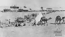 The Ottoman withdrawal back from Khan Yunis and Shellal, put enough distance between the two forces to require a pause in the advance, while the railway was laid to Rafa.[62] By the end of February 1917, 388 miles (624 km) of railway had been laid (at a rate of 1 kilometre a day), 203 miles (327 km) of metalled road, 86 miles (138 km) of wire and brushwood roads, and 300 miles (480 km) of water pipeline had been constructed.[63] And the Royal Navy undertook to land stores on the beach at Deir el Belah as soon as required and until the railway approached the Wadi Ghazzee.[64]