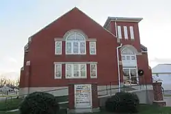 It was deemed notable " as a locally significant Period Revival interpretation of the early Christian Byzantine churches, with low massing and restrained ornament. It is of brick masonry with formed concrete basement foundation built on an "L" plan with intersecting gable roofs joined with a two-story vestibule/tower entry. Design details include large, stained glass, arch-headed windows centered in both gable ends above banks of stained glass sash windows, all trimmed with stone arches and lintels; corner buttresses with stone caps; stone coping at gable parapets; tower with wide eave overhang, shallow hip roof, louvered vents in the upper story and arch above the double door entry."[2]