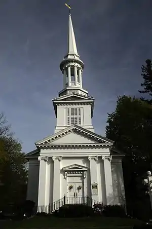 The Church's current facility was initially constructed in 1848 and was designed by Isaac Melvin of Cambridgeport.[9] It is known locally as the "Christopher Wren" church due to the fact that its architecture is inspired by the work of Christopher Wren such as St. James Piccadilly. The spire atop the bell tower was included in the cover art for Elvis Presley's 1967 How Great Thou Art gospel album, and the church has been a pilgrimage site for devoted Elvis fans since. The spire is also known throughout the area as a daylight navigation aid to shipping and recreational boating in Cape Cod Bay, as well as to surface traffic throughout town since the spire has line-of-sight to the surface for many miles.[9]