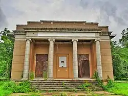It is a one-story raised brick building, with broad steps leading up to a portico of Ionic columns and a large entablature. It has double French doors with transoms leading to its sanctuary. The sides have three tall arched windows.[3][4]