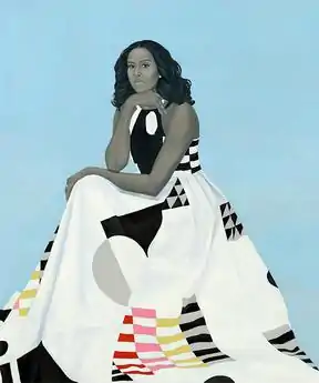 First Lady Michelle Obama, initially titled Michelle LaVaughn Robinson Obama, is a portrait of former First Lady of the United States Michelle Obama, painted by the artist Amy Sherald. Unveiled in 2018, it hangs in the National Portrait Gallery (NPG) in Washington, D.C. The six-by-five-foot (1.8 by 1.5 m) oil-on-linen painting shows Obama, rendered in Sherald's signature grisaille, resting her chin lightly on her hand, as a geometric print dress flows outward filling the frame against a sky-blue background.