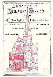 In February 1886, the Women's Home and Foreign Missionary Society of the Lutheran General Synod sent the Rev. Oliver C. Miller of Cedar Rapids, Iowa to San Francisco to organize the first Lutheran congregation in California to use English as its primary language for worship. On June 13, 1886 a congregation of 39 members formed and began to meet in Irving Hall at 139 Post Street in San Francisco. The congregation's first name was Women's Memorial Church.