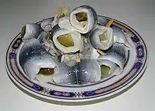 This is a result of differences in national tastes and changing fish stocks. To meet demand for cod, the most popular fish to eat with chips,[22] the UK imports 83 per cent of that fish it eats,[50] from international waters off Scandinavia, usually the Barents Sea, plied mostly by Icelandic, Norwegian and Russian vessels.[51] In turn, the herring abundant in British waters[52] is taken mostly by fishermen from other EU countries[53][lower-alpha 14] and exported to Germany where it is the third most popular fish, much of it used to make Rollmops, a comfort food similar to fish and chips popular as a hangover cure, since there is less demand for herring in the UK[52] than there was before the species was overfished in the 1970s; kippers have been a less common breakfast since then.[54][lower-alpha 15] Two-thirds of the UK's shellfish catch, at £430 million a quarter of all British fish exports by value, ends up in France and Spain; diners in the former country are also partial to saithe, a species largely passed up in the UK.[56][lower-alpha 16] British whelks also feed a thriving market in East Asia.[57]