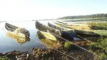 Fishing gear and methods used in Uganda are both modern and traditional. Fish in Uganda are caught mostly with plank canoes and to a lesser extent, fiberglass boats. Some dugout canoes are also still being used. The plank canoes are generally 4–12 m (13.12–39.37 ft) in length and dugout canoes average 3.5 m (11.48 ft). The total number of vessels is about 17,000 and about 20% of these are motorized.[1] Artisanal fishermen use various gear including gillnets, seines and hook and line. In a number of localities, traditional methods including baskets, traps and mosquito nets continue to be used.[2] The gear commonly used includes gillnets, lift nets, scoop-nets used in light fishing; hook and line gear (hand-lines, fishing rods or tackles) and fish traps.[3]