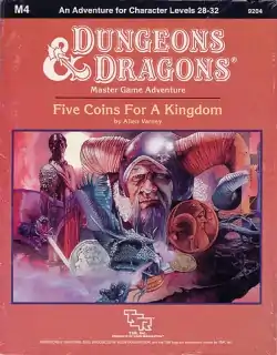 Five Coins for a Kingdom is an adventure module for the Dungeons & Dragons fantasy role-playing game, set in that game's Mystara campaign setting. TSR, Inc. published the module in 1987 for the D&D Master Set rules. It is part of the "M" series of modules. The module was designed by Robin Jenkins. Its cover art and interior art is by John and Laura Lakey, and cartography by William Reuter.