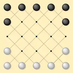 Five Field Kono (오밭고누) is a Korean abstract strategy game. A player wins by moving all of their pieces into the starting locations of their opponent's pieces.