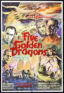 Five Golden Dragons is a 1967 international co-production comedy action film set in Hong Kong and photographed in Techniscope on location in September 1966[1] at the Tiger Balm Pagoda and Shaw Brothers studios.[2] It was directed by Jeremy Summers and starred Bob Cummings in his final theatrical feature film,[3][4] Margaret Lee who sings two songs in the film,[5] Rupert Davies and a cast of "guest stars".[6]