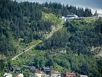 The Fløibanen is a funicular railway in the Norwegian city of Bergen. It connects the city centre with the mountain of Fløyen, with its mountain walks and magnificent views of the city. It is one of Bergen's major tourist attractions and one of Norway's most visited attractions. The line is 844 m (2,769 ft) long, covers a height difference of 302 m (991 ft), and carries over one million passengers a year. The line is owned by Fløibanen AS, a company with a number of shareholders, the biggest being the municipality of Bergen.[1][2][3]