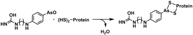 Many studies show that trivalent arsenic compounds bind to pairs of cysteine residues. This binding is responsible for the toxicity of many arsenic compounds.[4] Binding is reversed by 1,2-ethanedithiol, which binds tightly to arsenic compounds, as shown by the stability of FlAsH-EDT2.[5] Such strong sulfur-arsenic bond can be, again, regulated by designing a peptide domain that exhibits higher affinity toward the arsenic, such as tetracysteine motif. By modulating the distance between the two pairs of cysteine residues and the space between the arsenic centers of FlAsH-EDT2, a cooperative and entropically favored dithiol arsenic bond could be achieved.[6]