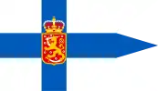 | Design | Sea-blue Nordic cross on white field, rectangular Coat of Arms of Finland (colours gold and silver on red), swallow-tailed, Cross of Liberty in canton (colors gold on blue) |