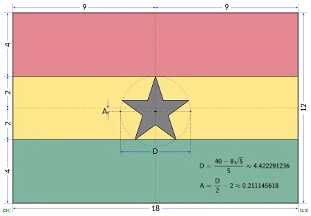 The Ghanaian flag was designed as a tricolour following in a sequence of red, gold and green.[7] The colours are a representation of the country's struggle for independence and a symbol of its rich resources within the geographical location[8] of the country among other African countries.[9] The three colours used are quite memorable with a star of the sky designed in a black colour within the centre, taking the centre coverage of the gold colour.[10]