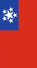 The flag adopted upon independence from the United Kingdom on 4 January 1948 consisted of a red field defaced with a blue canton. The blue canton was charged with one large white star surrounded by five smaller stars between its rays. The big white star in the canton and the red field honour the Resistance Flag and indicate the anti-fascist struggle. The four small white stars between the rays of the big white star symbolize the unity of various ethnic races of the republican union founded due to the resistance. The red represents bravery, courage, and preservation. The blue canton means the nature of the sky, having deep meanings, the fresh and clear mind, and the light emitted in the night sky. The usage of stars is for the nature of the stars: never stopping, never cancelling the chosen path, always moving forward, being a guide for travellers, and existing since the beginning of the world, while the colour white represents purity, righteousness and steadiness.[5] This flag has a ratio of 5:9.[6] On 3 January 1974, it was replaced by the State Flag of the Socialist Republic of the Union of Burma.[7]