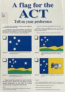 In 1993, following a 1992 motion by Opposition leader Trevor Kaine, the ACT Government commenced a process to develop and select an ACT flag.[2] The ACT Government selected four options and surveyed the public between 19 February[3] and 5 March 1993[4] to find the public's preference.