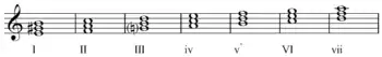 The exact chords depend on the song form (palo) and guitar chord positions[3] since chord voicings in flamenco often include nontriadic pitches, especially open strings.[4] It is characteristic that III, ♭II, and I appear as dissonant chords with a minimum of four tones[3] (for example seventh chords or mixed third chord). Since the tetrachord beginning on the tonic may ascend or descend with either G-sharp or natural (Phrygian tetrachord), the mixed-thirds clash between the major third degree (G♯) in the melody and the minor third degree (G♮) in the accompanying harmony occurs frequently and is characteristic of the flamenco esthetic, as with the blues scale on a major chord.[5]