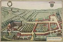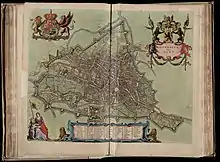 From 1632 Sanderus began with the first studies for his work. In 1634 he signed a contract with Hondius. After some time tensions arose: Hondius had begun the work with the material he already received, but had to interrupt the production process repeatedly because of articles and drawings that were still lacking.[3] Hondius himself remained not free from blame: he sent back several drawings and maps for (unnecessary) corrections while failing to implement the corrections that Sanderus suggested.[4] Hondius was so thoroughly tired of the situation that he sold the Flandria Illustrata to its competitor brothers Blaeu without even notifying Sanderus nor Johannes D'Hondt. Meanwhile the publication already advanced fairly well.[5] Although the publication was initially planned for Easter 1637, it would take almost four more years until the first volume appeared on April the first 1641.
