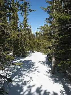 The Flattop Mountain Trail, also known as the Grand Trail or the Big Trail, was built in 1925 in Rocky Mountain National Park in the Larimer County portion of the U.S. state of Colorado. Built in 1925, and rehabilitated in 1940 with Civilian Conservation Corps labor, it is listed on the National Register of Historic Places. The trail begins at 9500 feet of elevation at Bear Lake and climbs Flattop Mountain to a maximum elevation of 12,324 feet on the Continental Divide.[2]