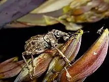 The flax weevil was described by Albert E. Brookes in 1932 based on a series of specimens sent to him by Ernest Richard Fairburn. These were collected at its type locality of D'Urville Island in the Marlborough Sounds in 1931. The type specimen is held at the New Zealand Arthropod Collection. It was described as large and robust in form and ranging in size from 20–24mm.[1] Specimens can range in colour from coppery-brown to dark brown, or even black in older weevils that have lost their scales. They have distinctive pairs of tubercles mid-way along and at the base of the elytra. Larvae are large with a cream coloured body and brown head. The adult is flightless.[2]