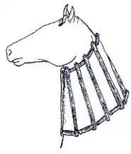 A collar designed to teach horses to tie up and to tie stallions at public events. It is constructed from double-stitched wide leather (sometimes fleece lined), with heavy duty dees sewn into each end. The collar is placed on a horse just behind the poll strap of a headcollar (headstall) which is used in conjunction, and a strong rope passes through the headcollar to secure the two dees so that the horse's wind is not impaired in any way. This manner of application will reduce the likelihood of the collar slipping and injuring or choking the horse. Sometimes used for tethering horses, they are expensive and are potentially dangerous if the horse should become entangled in the tether or frightened, etc.[8]