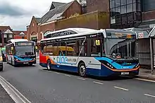 Mercedes-Benz Varios used to form the backbone of the fleet, but in 2008/09 the company upgraded its fleet with the purchase of four new Optare Solos and four Optare Versas, as well as two Caetano Nimbuses that previously operated with Travel de Courcey and Reading Buses. These buses were painted in a livery of yellow (lower body) and black (upper body).[21] Afterwards, other Stagecoach-branded buses replaced the remainder of the step-entrance fleet.