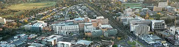| Aerial view of the southeastern portion of Flemington Road (running from left to right) in 2010, prior to the construction of the Victorian Comprehensive Cancer Centre in the far southeast (bottom-right). Click to enlarge. | |