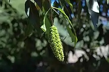 Flindersia pimenteliana is a tree that typically grows to a height of 36 m (118 ft). It has pinnate leaves 70–250 mm (2.8–9.8 in) long arranged in more or less opposite pairs with three to seven, egg-shaped to elliptic leaflets 35–120 mm (1.4–4.7 in) long and 13–50 mm (0.51–1.97 in) wide. The side leaflets are on a petiolule 3–15 mm (0.12–0.59 in) long and the end leaflet on a petiolule 12–40 mm (0.47–1.57 in) long. The flowers are arranged in panicles 90–170 mm (3.5–6.7 in) long, the five sepals about 1 mm (0.039 in) long and the five petals red or reddish and 2.5–4 mm (0.098–0.157 in) long. Flowering occurs from November to February and the fruit is a woody capsule 60–90 mm (2.4–3.5 in) long and studded with rough points up to 4 mm (0.16 in) long. The fruit opens into five valves, releasing winged seeds 40–60 mm (1.6–2.4 in) long.[2][3]