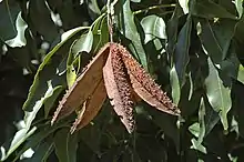 Flindersia pimenteliana, commonly known as maple silkwood, red beech or rose silkwood,[2] is a species of tree in the family Rutaceae and is native to New Guinea and Queensland. It has pinnate leaves with three to seven egg-shaped to elliptic leaflets, panicles of red or reddish flowers and fruit studded with rough points.