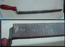 A woodworking float (more rarely used in silversmithing),[1] also called a planemaker's float, is a tapered, flat, single cut file[2] of two types: edge float and the flat sided float[3] which are traditional woodworking tools generally used when making a wooden plane. The float is used to cut, flatten, and smooth (or float) key areas of wood by abrasion. Despite the name its woodworking uses go well beyond planemaking.