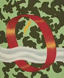 An untitled and undated work, showing a ring-like object at an angle to the ground, is typical. The viewer sees both the inside and the outside of the red ring, a stream of color passes through the ring, and near the top of the ring there is a leaf-shaped object in yellow.[3] In another representative work, "66," painted in 1966, there a band of yellow-orange slinking among red objects, along with blocks of blue and pink and a vertical red on the right edge.[2] One of her last paintings, "1972-3" of 1972, shows the dynamism of her late style.[12]