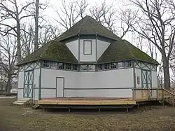 The Floral Hall was constructed in 1884 at the fairgrounds in Bowling Green; it originally held horticultural exhibits, although in the 20th century it was renamed "Needle Hall" after it began hosting needlework exhibitions. In later years, the fair moved to another location, the original grounds were converted into a city park, and all other buildings from the fairgrounds were eventually destroyed. However, the city retained the floral/needle hall, changing it into a picnic shelter and carefully attending to the building's upkeep.[3]