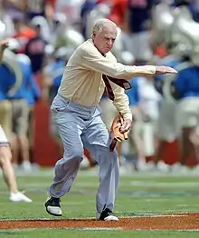 - George Edmondson (a.k.a. "Mr. Two Bits"), wearing his trademark yellow oxford shirt, blue seersucker trousers, orange-and-blue tie, and black-and-white saddle shoes, traveled around the stands for almost 60 years leading fans in the old "Two Bits" cheer ("Two bits! Four bits! Six bits! A dollar! All for the Gators, stand up and holler!"). Edmondson began the tradition in 1949 and "retired" to become a regular fan after his 50th season in 1998. However, he couldn't stay in his seat and continued to lead the cheer during pre-game festivities and (occasionally) in the stands during games. On November 22, 2008, at the last home game of the season, Mr. Two Bits was again honored with a retirement ceremony.[53] Since then, a series of "guest Mr. Two Bits" (usually former star Gator athletes) have led the pregame cheers.