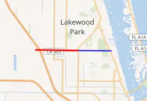 State Road 614 (SR 614), locally known as Indrio Road, is a 3.6-mile-long (5.8 km) eastwest street serving a rural section of northern St. Lucie County, Florida, just south of Lakewood Park. The road has a 2.8 miles (4.5 km) eastern extension designated County Road 614 (CR 614).