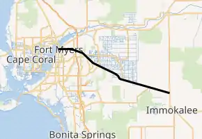 Much of the highway east of Lehigh Acres was upgraded and widened to a multi-lane divided highway in the late 2010s and early 2020s. The continuous-flow intersection (CFI) at the Daniels Parkway/Gunnery Road intersection was the first CFI built in Florida, which became fully operational on July 9, 2019.[4][5]