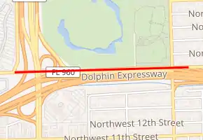 SR 960 begins at the foot of the Dolphin Expressway exit off-ramp serving Northwest 37th Avenue/Douglas Road. Between these two points, the road runs one way westward. SR 960 then passes underneath two overhead exit ramps, one of which serves Miami International Airport from the Dolphin Expressway, and intersects LeJeune Road (SR 953). After passing underneath the Northwest 12th Drive bridge, the route comes to an abrupt end at Northwest 42nd Court.[1][2]