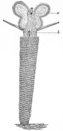 Adult Floscularia ringens make parthenogenetic eggs that are kept in the tube.[1] After the eggs hatch, the young stay in the maternal tube for a little time to finish developing before swimming off.[1] A young Floscularia ringens has a cone-shaped body, short foot, little corona, and mastax with trophi, but it still seems to not be able to eat.[1] In less than one day, the young Floscularia ringens makes a lasting connection to a substrate.[1] Its corona now has four lobes, and the foot lengthens.[1] After the corona develops the Floscularia ringens starts to eat through making currents, and it also begins to create its tube.[1]