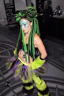 A girl in a cyber outfit wearing green and black furry leg warmers