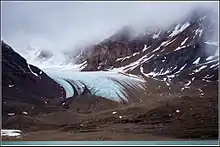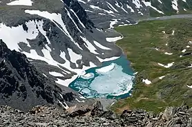 A proglacial lake is an impoundment of water prevented from flowing by a glacier or glacial till dam. Proglacial lakes are usually the byproduct of glacial meltwater. The sediment contained in a proglacial lake is a useful geochronological tool that records patterns of change in a glaciated region. [25] Proglacial lakes may be dammed by a moraine, glacial ice, or may be trapped at the snout of a glacier by the isostatic depression of the crust by the glacier.[26],[27] A tarn is a specific term for a proglacial lake that forms in the over-deepened bowl of a cirque.[9]